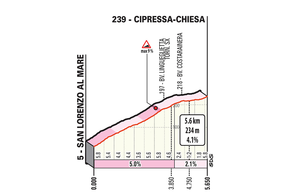 A Imperia si rientra nel percorso classico per affrontare la Cipressa da San Lorenzo al Mare e poco dopo il Poggio di Sanremo. La Cipressa, lunga 5600 metri, con una pendenza media del 4.1%, è stata inserita negli anni ’80 nel percorso della Sanremo: più che le rampe in salita, è la discesa tecnica ad impensierire maggiormente, dal momento che nella prima parte si può fare selezione.