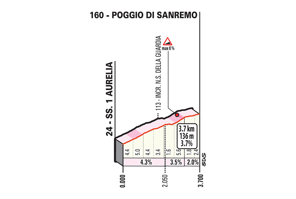 A 9 km al traguardo arriva il Poggio, l’ultima asperità di giornata: sono 3.7 km con pendenza media del 4% e punte del 8% in prossimità della vetta. I tanti corridori che vorranno evitare la volata dovranno necessariamente attaccare qui e tenere duro negli ultimi 6 km, quattro dei quali sono in discesa tecnica, con curve e tornanti.