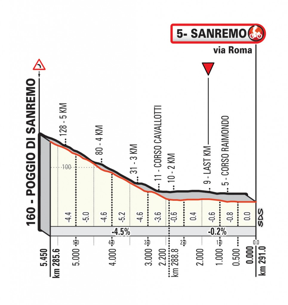 Ultimi duemila metri pianeggianti situati nel centro cittadino. Ultima curva a 750 metri, prima del rettilineo finale in Via Roma. Se nessuno sarà riuscito ad operare la giusta selezione, sarà volata. In basso tutti i profili tecnici (altimetria, planimetria, dettaglio Poggio e Cipressa, ultimi chilometri, arrivo e cronotabella).
