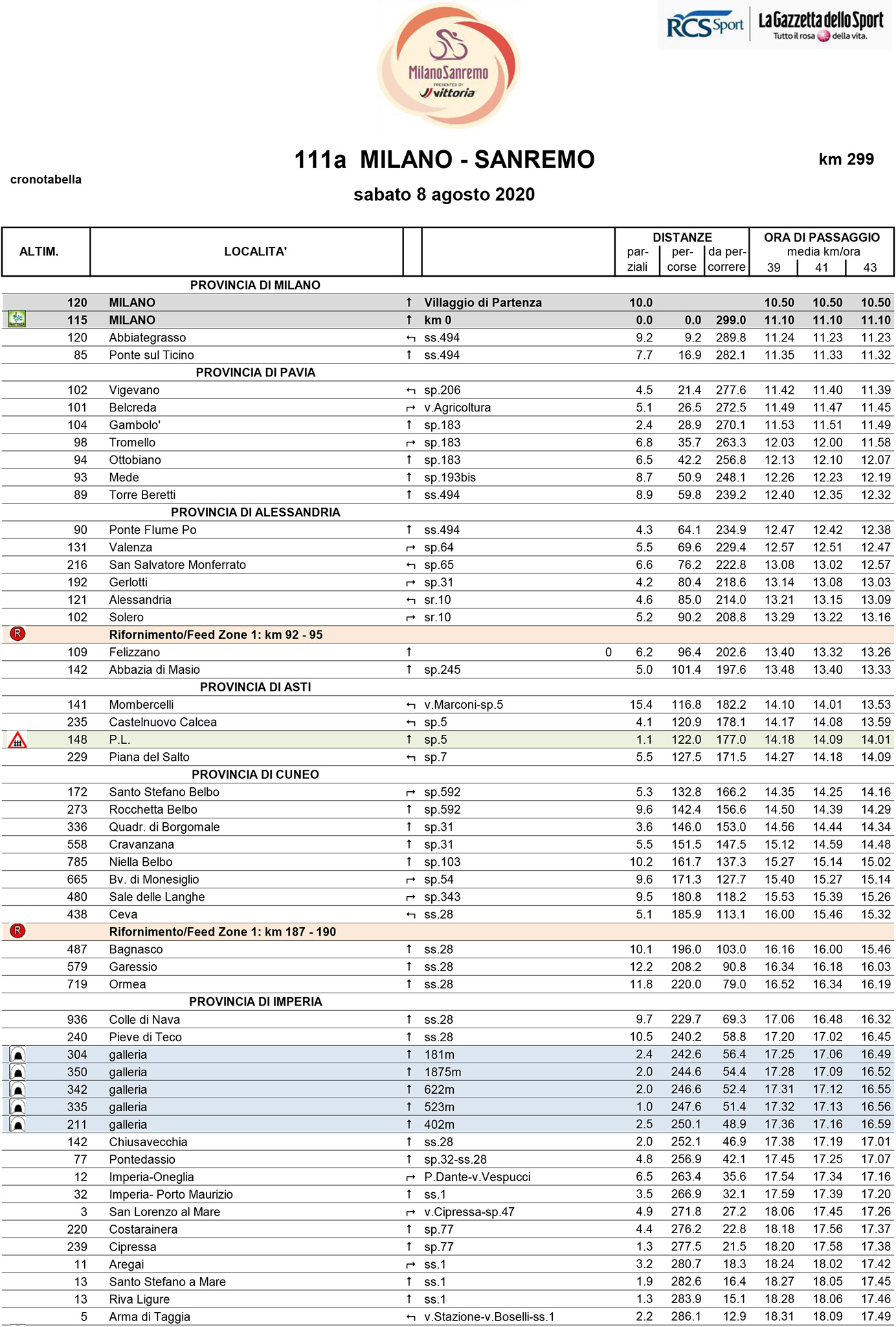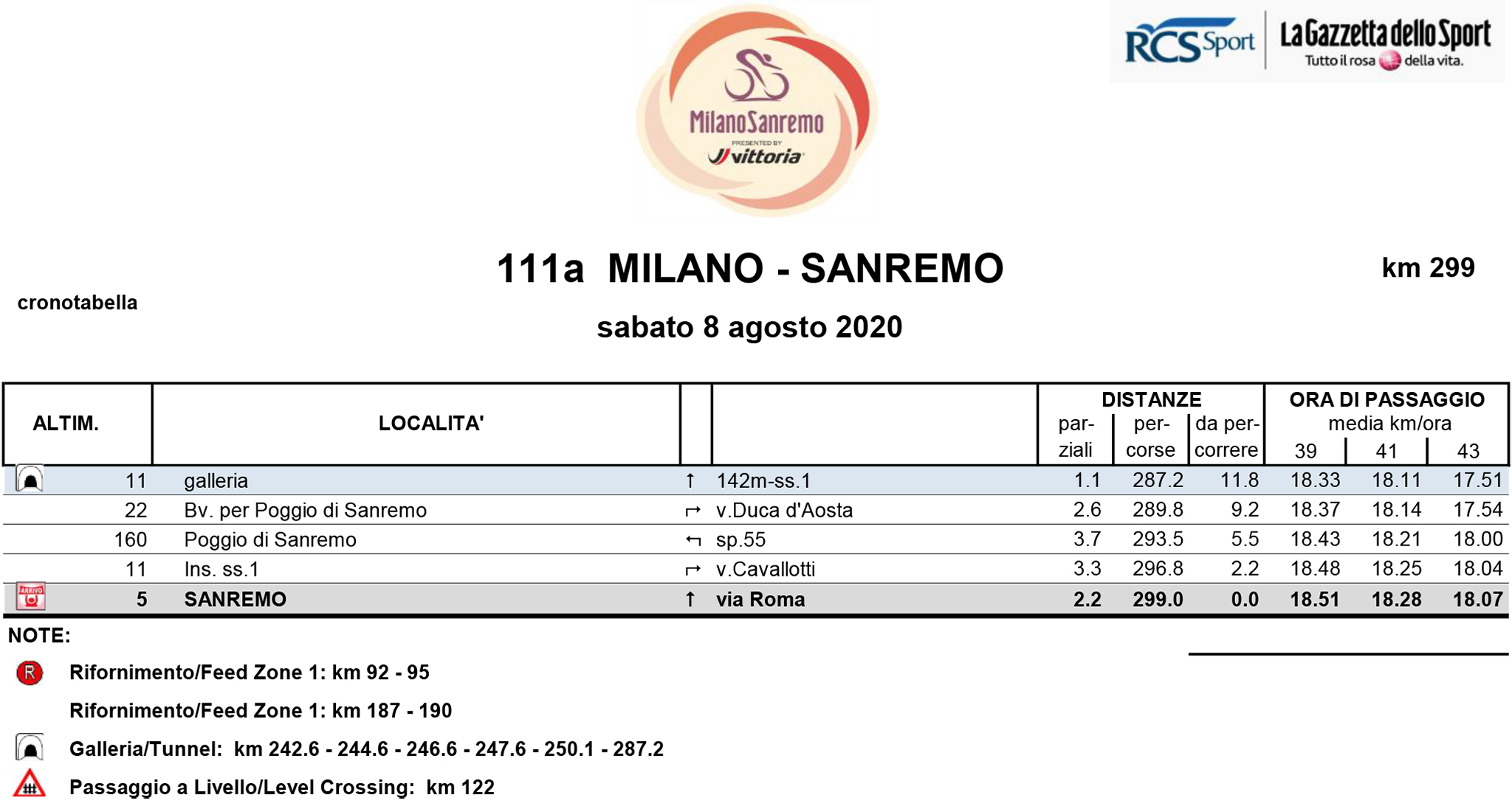 La Classica di Primavera diventerà per l’occasione Classica d’Estate, ma la Classicissima per eccellenza conserverà ugualmente il fascino di corsa più imprevedibile – e dunque più spettacolare – dell’intero calendario internazionale: è la Milano-Sanremo, la cui edizione numero 111 si disputerà sabato 8 agosto 2020.