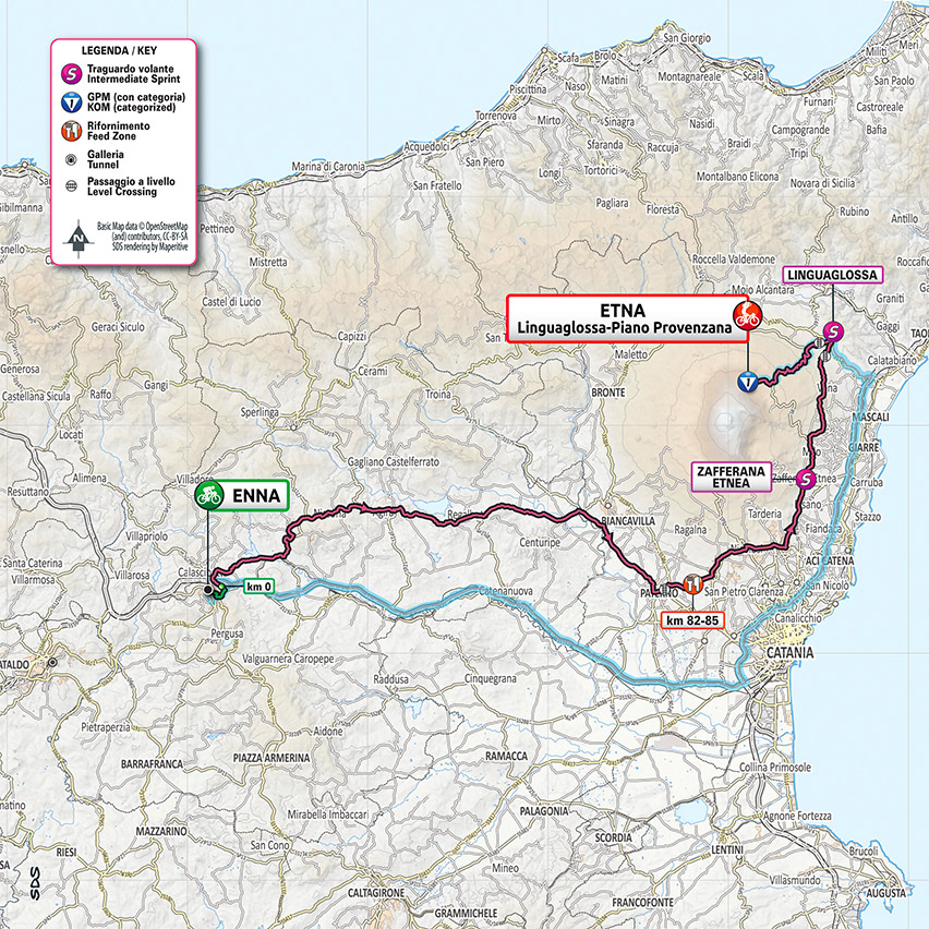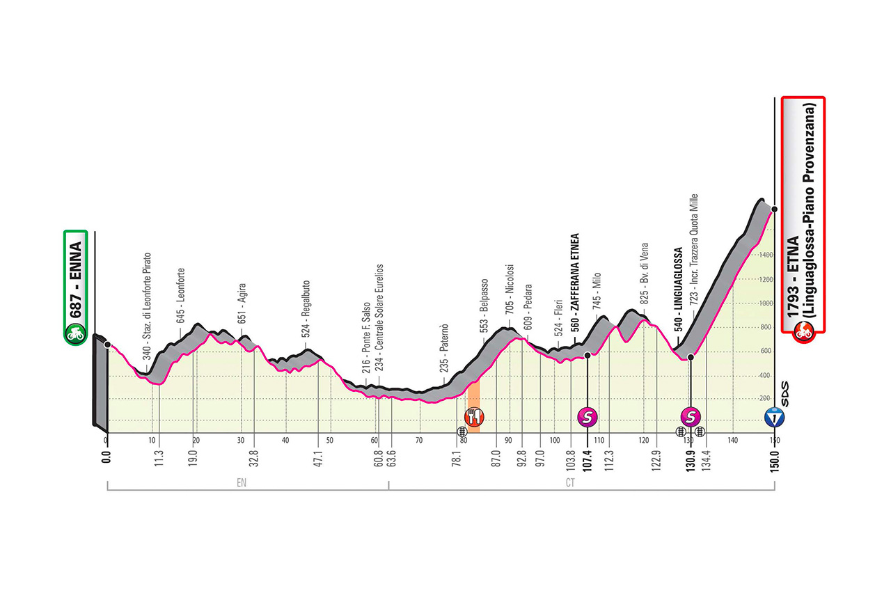 Prima della scalata finale, comunque, c’è un continuo saliscendi, sebbene nessuna delle altre asperità sia classificata come Gran Premio della Montagna. A Zafferana Etnea (km 107.4) e Linguaglossa (km 130.9) sono presenti i due traguardi volanti.