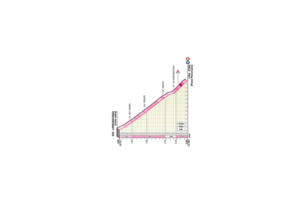 Si affronterà un versante inedito dell’Etna, quello da Linguaglossa: si tratta di ben 18.8 km con una pendenza media del 6.6%, ma il tratto pià duro è nel finale, con la ripidità che arriva al 13%. C’è poi l’incognita vento, nel finale, che potrebbe scoraggiare eventuali attacchi.