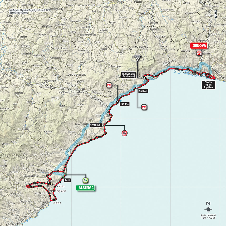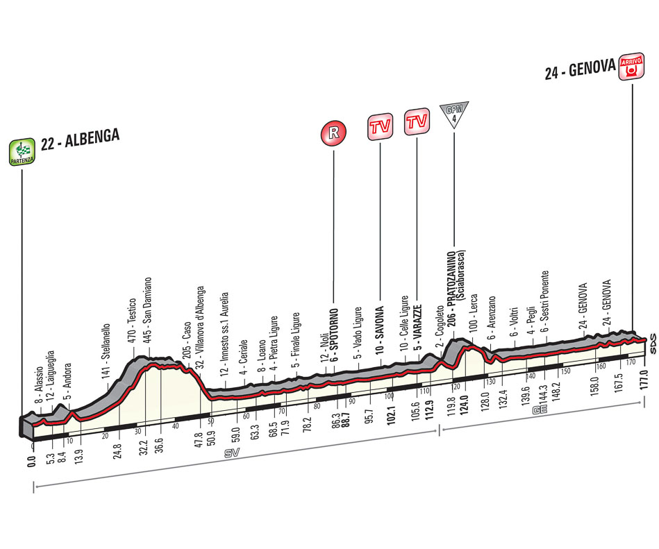 La Albenga-Genova, di 177 km è la prima frazione in linea del Giro d’Italia 2015. Tappa destinata ai velocisti per via della parte finale completamente pianeggiante. Parte iniziale più mossa, in virtù del transito nel circuito affrontato annualmente al Trofeo Laigueglia, che prevede anche la caratteristica salita del Testico, per poi scalare il primo GPM di quest’edizione, Pratozanino (4^ cat., 206 m), presso Cogoleto. Due i traguardi volanti in programma, molto ravvicinati: Savona al km 102 e Varazze al km 112. Giunti a Genova, un circuito cittadino di 9.5 km da ripetere due volte, con traguardo posto in Via XX Settembre.