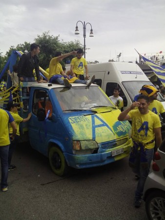 Già alla fine del primo tempo, terminato 2-0, le vie limitrofe allo stadio si sono trasformate in un’autentica bolgia, scandita da cori, slogan, trombette, striscioni, abbracci e pianti di gioia.