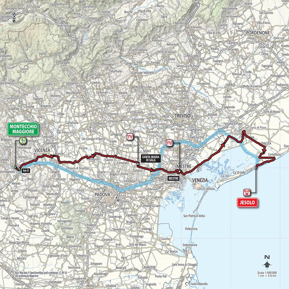 Montecchio maggiore è all’esordio come città di partenza di una tappa, mentre per quattro volte il Giro ha visto il traguardo a Jesolo: nel 1955 si impose Benedetti), nel 1970 Zandegù, nel 1987 Cimin e nel 1988 Di Basco.