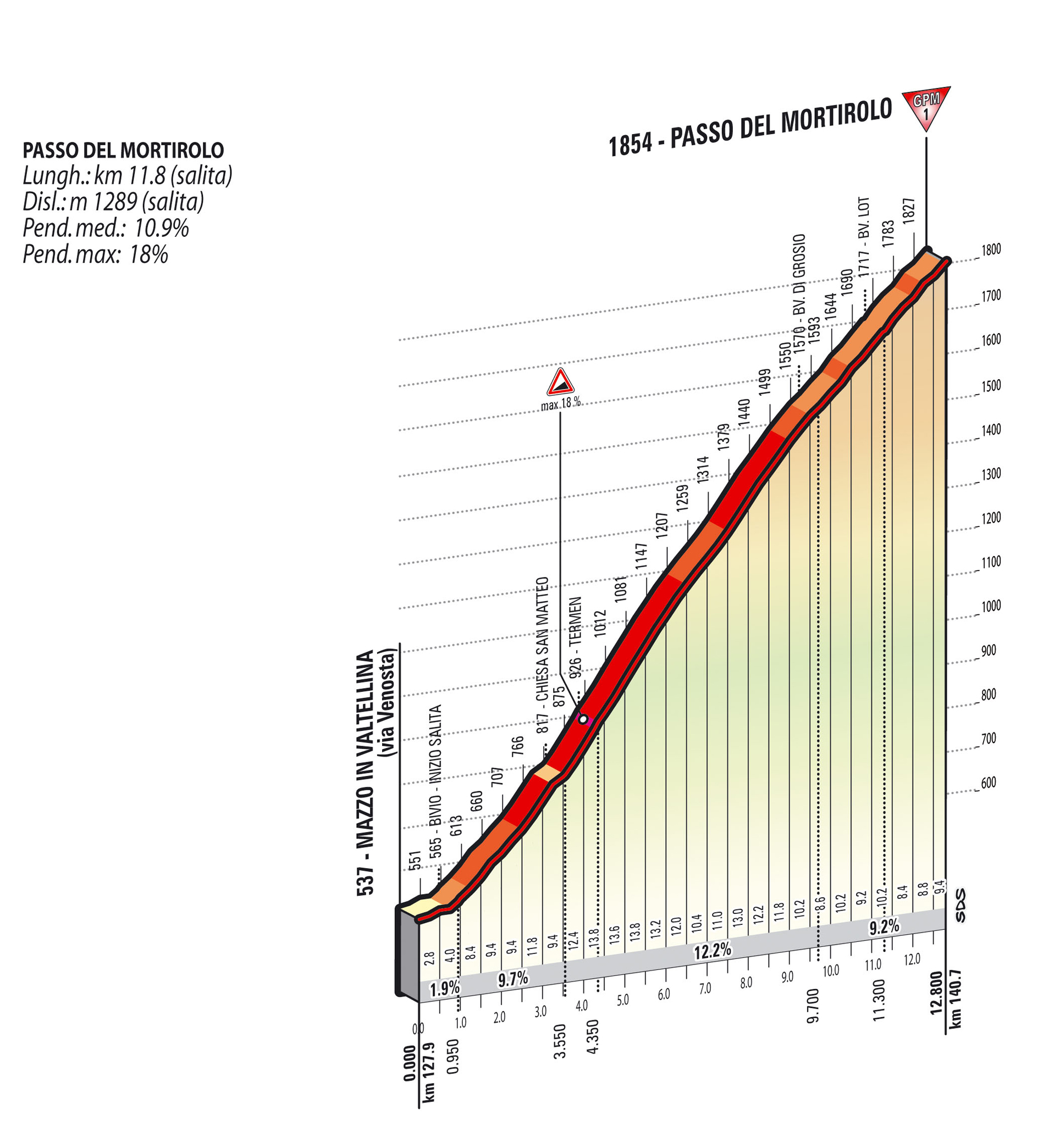 Partenza alle 11.40 e subito il GPM di Campo Carlo Magno (2^ cat.), seguito da una veloce discesa su Dimaro e dalla scalata al Passo del Tonale: è ancora un 2^ categoria, ma i chilometri di lunghezza sono ben 15.3, con una pendenza media del 6.1%. Ancora una discesa, che attraversa Ponte di Legno per portare i corridori a Edolo, dove il traguardo volante di Corteno Golgi fa da apripista alla prima scalata all’Aprica: è l’ascesa più facile di giornata, un 3^ cat. lungo 14 chilometri con pendenza media del 3.5%. Rampe pedalabili, dunque, che saranno scalate anche nel finale, dopo aver affrontato, però, il secondo traguardo volante a Tirano e, soprattutto, lo spauracchio di giornata, il Mortirolo.