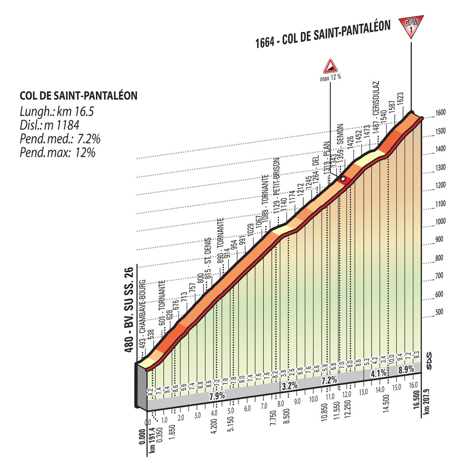 Il primo è il Col de Saint-Barthelemy (1^ cat., 11.6 km al 6.7% e punte al 13%). Poi venti chilometri di discesa e di nuovo all’insù verso il Col de Saint-Pantaléon (1^ cat., 16.5 km al 7.2% e punte al 12%). A quel punto sono già stati affrontati 2” chilometri, ma la tappa non è ancora finita. Dopo la discesa, infatti, si torna a salire verso Cervinia: ancora un 1^ categoria, di 19 km di lunghezza con pendenza media del 5.2% e massima del 12%. Delle tre, forse è la salita più pedalabile, ma posta dopo una tappa molto lunga e dopo aver già affrontato impegnative salite, farà sicuramente male.