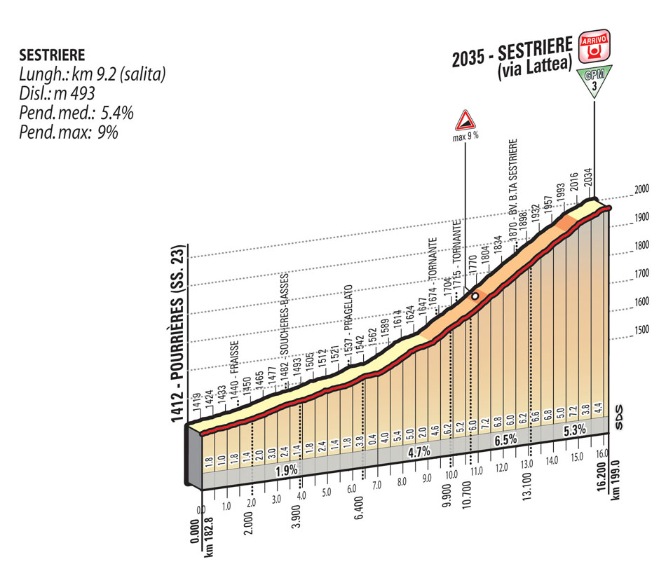 E’ una montagna recente nella storia del Giro, il Colle delle Finestre, scalata soltanto nel 2005 e nel 2011 e caratterizzata dalla presenza di una prima parte regolarmente asfaltata ed una seconda in sterrato, che regalerà uno spettacolo d’altri tempi e che le ha già permesso, in pochi anni, di conquistare il cuore dei tifosi. E’ lunga, ben 18.6 km, e molto impegnativa, 9.2% di pendenza media e 14% di pendenza massima. La cima è posta ai meno 28 chilometri al traguardo, contraddistinti da una discesa tecnica su carreggiata stretta e poi dalla scalata al Sestriere (3^ cat.), 11 km al 6%. Dopo tre settimane di corsa e tanti colli scalati, anche un 3^ categoria si rivelerà fatale: sebbene appaia già chiaro, qui conosceremo il vincitore del Giro d’Italia 2015.