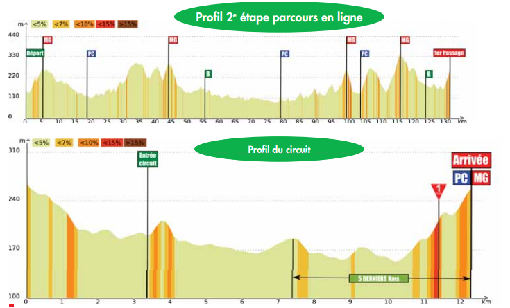 Ci troviamo nella regione dei Paesi della Loira per questa cinque giorni aperta da un cronoprologo di 4.5 km nella città di Laval. I pur minimi distacchi nella prova contro il tempo possono già risultare decisivi, dal momento che le successive frazioni non presentano grossi ostacoli. Fa eccezione la penultima frazione, da Chantrigné a Hambers, con le scalate al Mont Rochard e al Montaigu (2 km a 7% di pendenza media) che possono apportare ulteriori modifiche alla classifica generale. Di seguito l’elenco delle tappe e tutte le altimetrie.