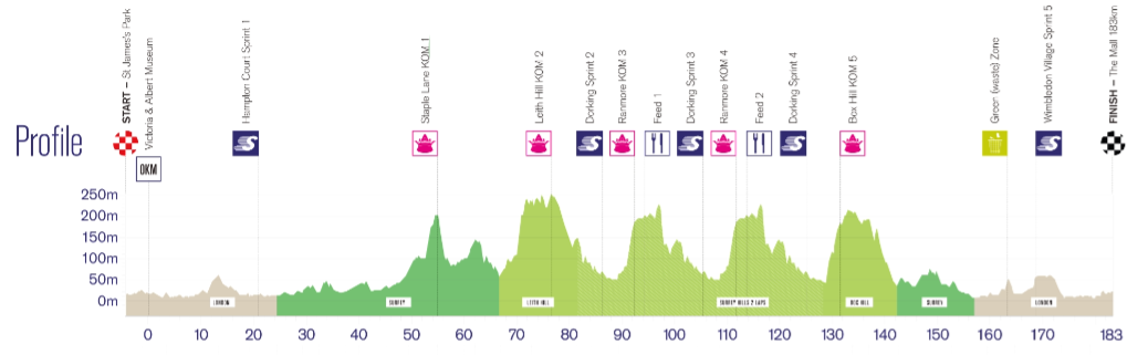 Non mancano le caratteristiche colline inglesi lungo l’intero tracciato – i cinque Gran Premi della Montagna previsti sono Staple Hill, Leith Hill, Ranmore (da affrontare due volte), Box Hill – ma il finale vede favoriti i velocisti, da momento che l’ultima vera insidia è posta a oltre 50 km al traguardo, davvero molti per pensare di poter fare la differenza.
