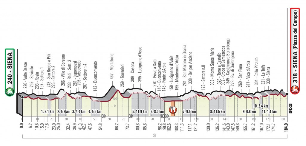 Ma subito dopo quest’ultimo ci sarà la dura salita di Le Tolfe, la cui vetta sarà a soli 12 km all’arrivo. Ultimi chilometri nell’abitato di Siena: si entrerà da Porta Fontebranda (salita) fino ad arrivare a Piazza del Campo, la cui strada lastricata, con pendenze che arrivano al 16% fino ai 100 metri finali, decreterà il vincitore.