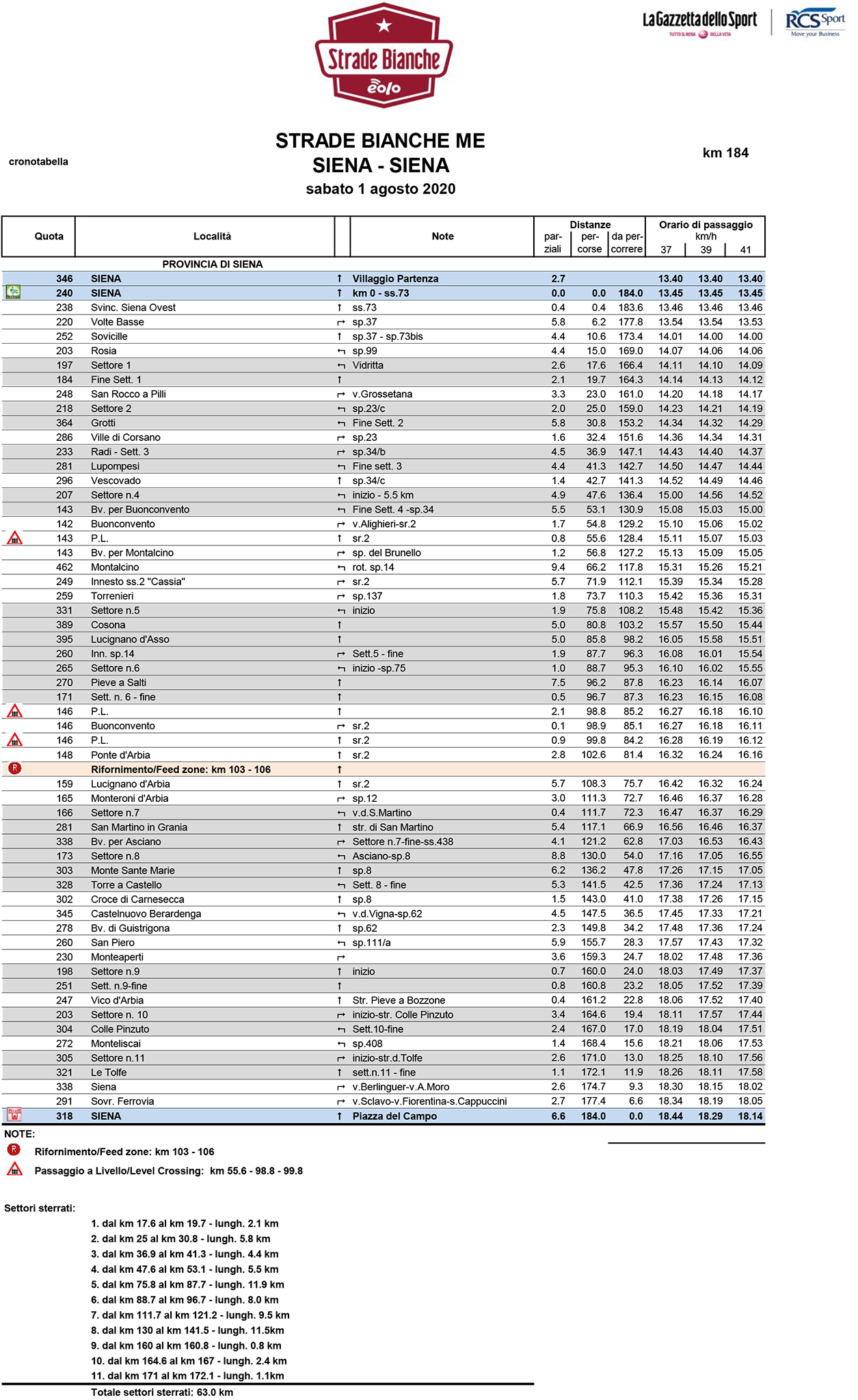 D’ora in poi un finale costantemente mosso: a Monteaperti, in particolare, si affronteranno soli 800 metri di strade bianche, ma con pendenze che raggiungono la doppia cifra. Gli ultimi due tratti in sterrato saranno il decimo (2.4 km in salita verso Colle Pinzuto (punte al 15%), e l’undicesimo (1.1 km).