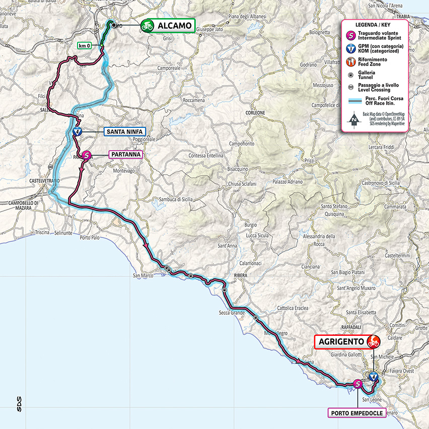 Superati i due sprint intermedi a Partanina e Porto Empedocle, alla fine il GPM di Agrigento (4^ cat.), dalla lunghezza di 3.7 km con una pendenza media del 5.3%. I corridori da Classiche – non molti, per la verità, essendo impegnati al Nord – sono pronti a giocarsi questo traguardo. Peter Sagan e Michael Matthews paiono i maggiori indiziati.