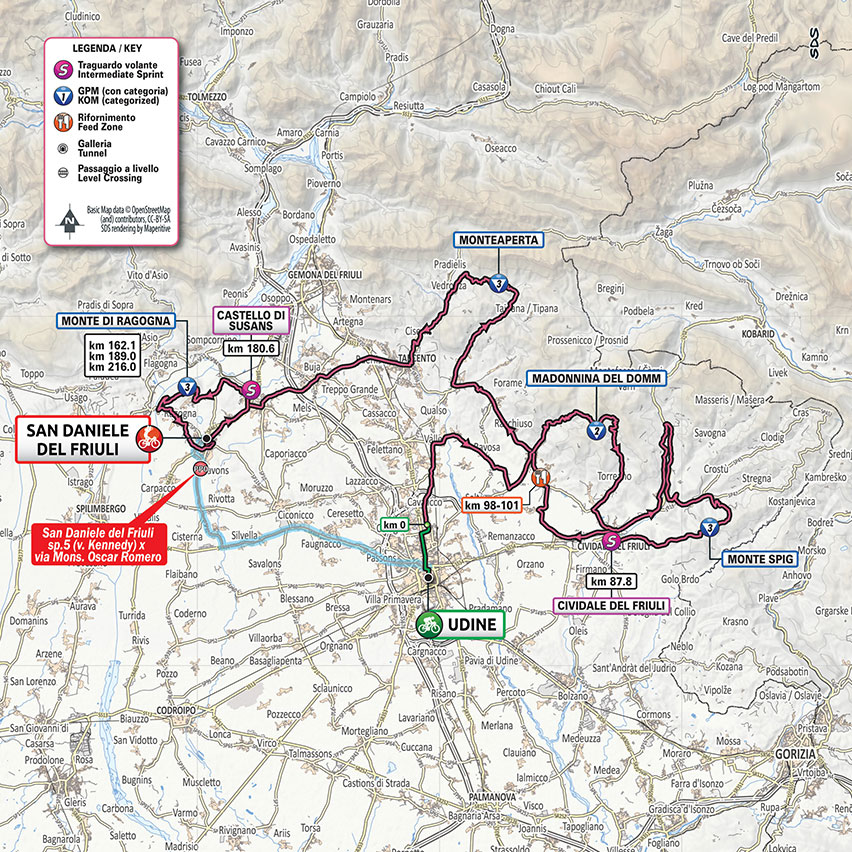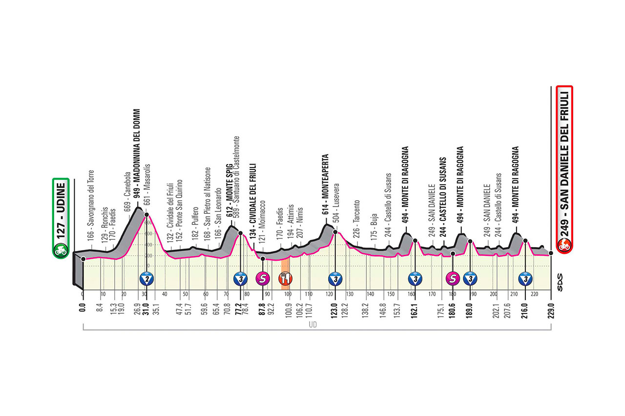 La frazione friulana è molto dura, sebbene le salite in programma siano spesso brevi e dalle pendenze molto accentuate. In primis i corridori dovranno affrontare una salita molto dura, ma poiché piazzata in apertura, non provocherà danni, se non l’inizio di una fuga: è la Madonnina del Domm, 10.8 km al 7.1% di pendenza media. Poi sarà la volta del Monte Spig, 6.4 km al 7% di pendenza media e ancora Monteaperta, 3.7 km al 7.4%.
